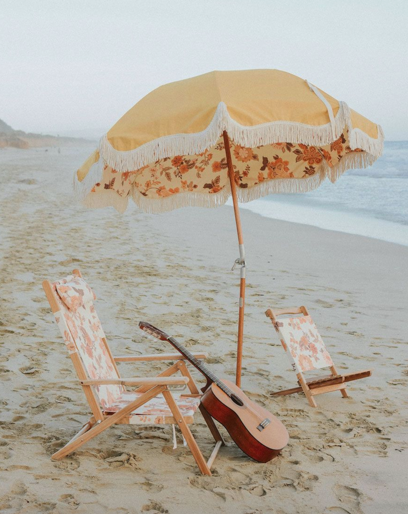 We love their laid back, luxe, and vintage take on beach accessories, umbrellas, and chairs.