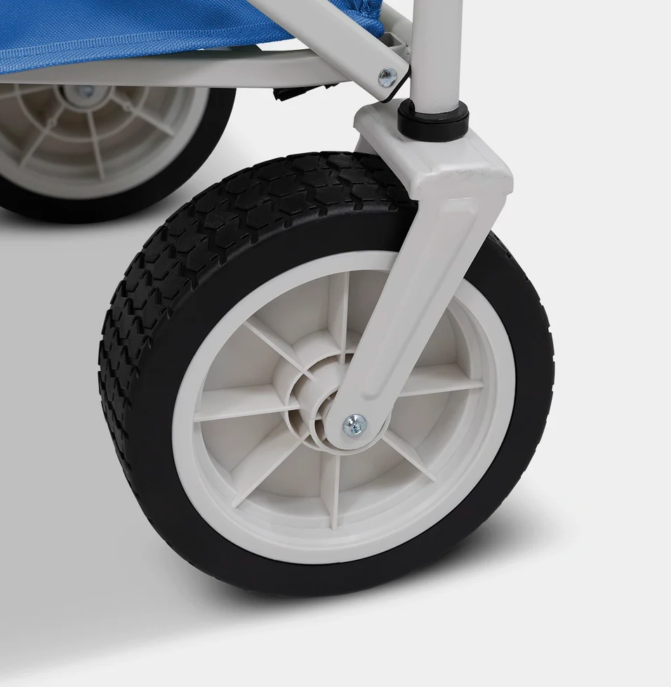 Get ready for sunny adventures with the Ocean Meridian Beach Cart, a stylish, practical companion in bold royal blue with cream accents. Designed to glide effortlessly over sand with its large wheels, this cart makes transporting all your beach essentials a breeze. The retractable pull handle and adjustable push handle add ease to every trip, while the spacious basket and rear storage bag let you pack everything you need for the day. Two built-in drink holders keep refreshments close at hand, and an internal pouch secures your valuables. Built with a lightweight yet heavy-duty steel frame, this cart can hold an impressive load and folds neatly for easy storage. Perfect for beach days, picnics, or any outdoor adventure!