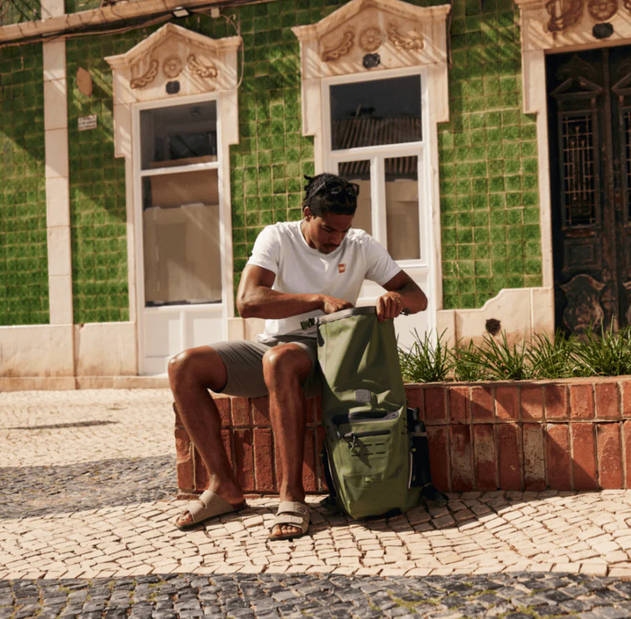 Constructed in highly durable recycled fabric with reliable roll-top closure, it’s totally watertight. Gear stays well protected, with a reinforced base, waterproof and water-resistant external stash pockets, plus removable padded laptop sleeve. Your safety’s boosted too, thanks to reflective detailing and a built-in emergency whistle.