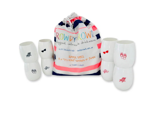 Bring the fun to every beach day with this 8-pack of “Rowdy Summer Vibes” printed wine tumblers. Each cup features its own unique mix of colour and icon — no more drink mix-ups, just easy summer sipping.