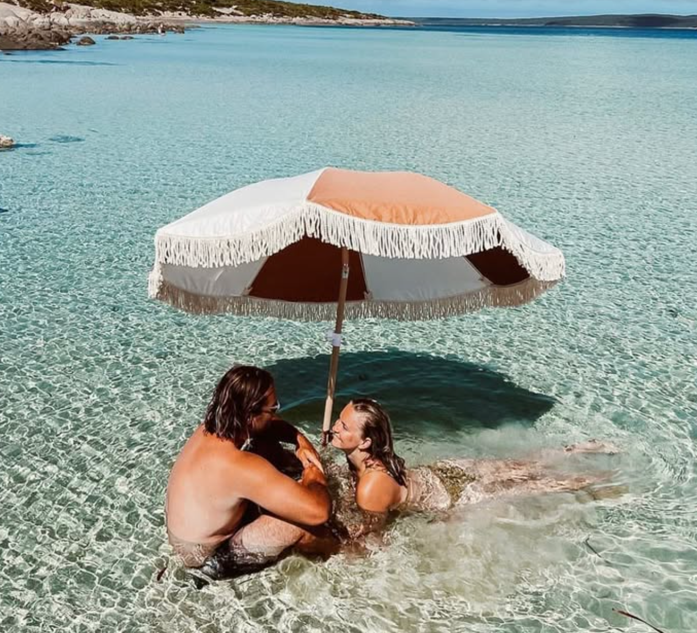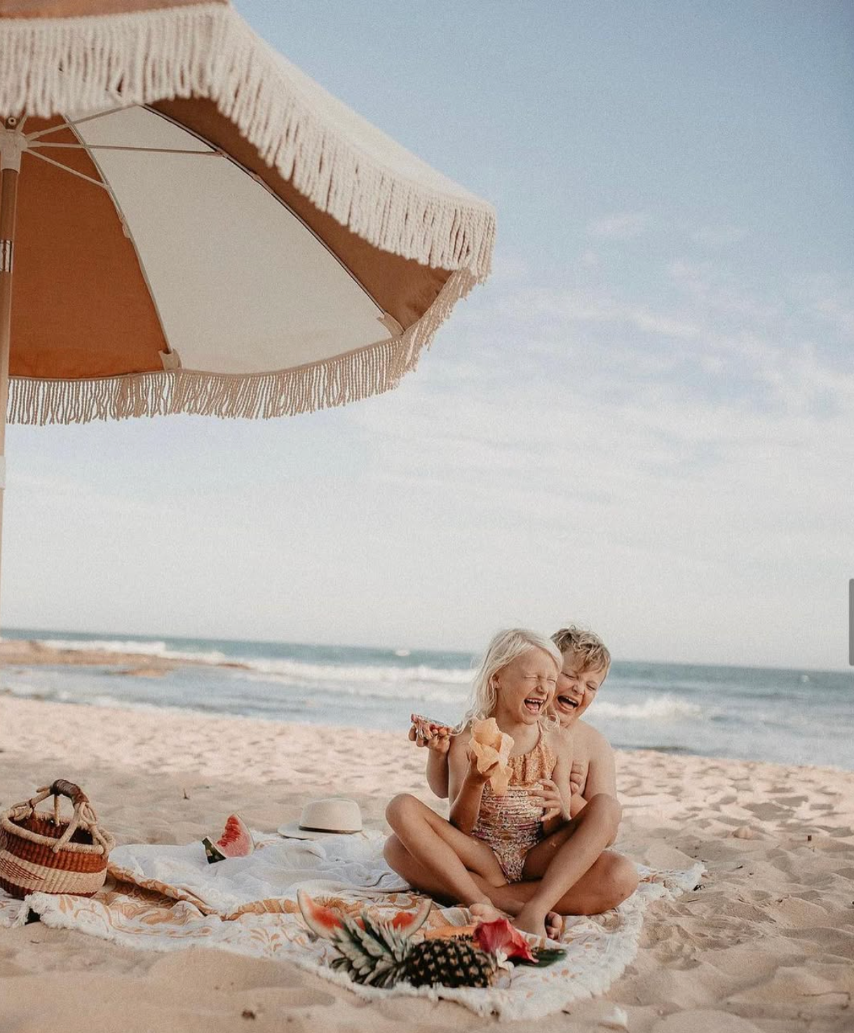 A nod to vintage French seaside style, The Goldie brings soft coffee and beige tones to your beach days. With its sun-faded stripes and effortless coastal charm, it’s the umbrella made for slow mornings, sandy afternoons, and every summer story in between.